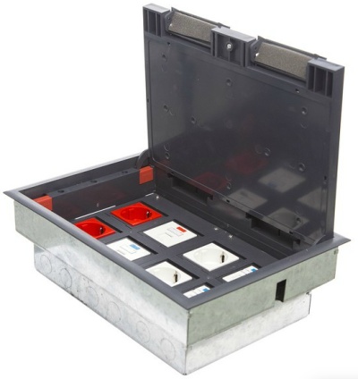 Главная / Каталог / Люки напольные и Колонны / Люки для розеток в пол и в стол / Напольный люк для розеток / Люк напольный на 8 модулей (8 розеток 45х45) / 70083 (70080+70180) сталь Экопласт LUK/8 Люк в пол