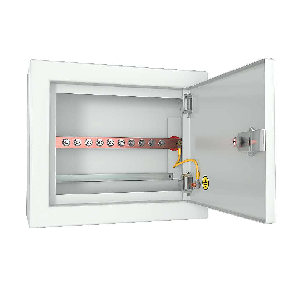 Стальной электрический щит IP31 с оцинкованной монтажной панелью, на которую установлена медная заземляющая полоса. Корпус стандартной комплектации: IP-31. Ящик выполнен из холодно-катанного тонколистового стального листа толщиной 1 мм. Конструкция ящика цельносварная, задняя стенка имеет четыре отверстия d=8 мм для крепления к стене, передняя дверь оснащена точечным замком. В нижней части шкафа имеются круглые отверстия d=32 мм для заведения кабеля заземления. Медная шина располагается горизонтально, крепиться через изоляторы SM-25 к оцинкованной монтажной панели, медная шина укомплектована винтами М6х12 и гайками с фланцем с насечкой М6.