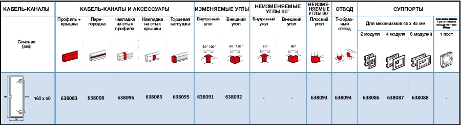 Таблица аксессуаров для Кабель Канала 160x50 арт. 638083 LEGRAND METRA УСТАНОВОЧНЫЙ Аксессуары к кабель каналу серии METRA 638083 160x50 LEGRAND