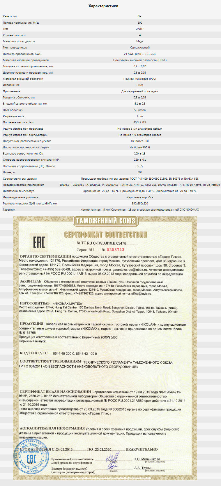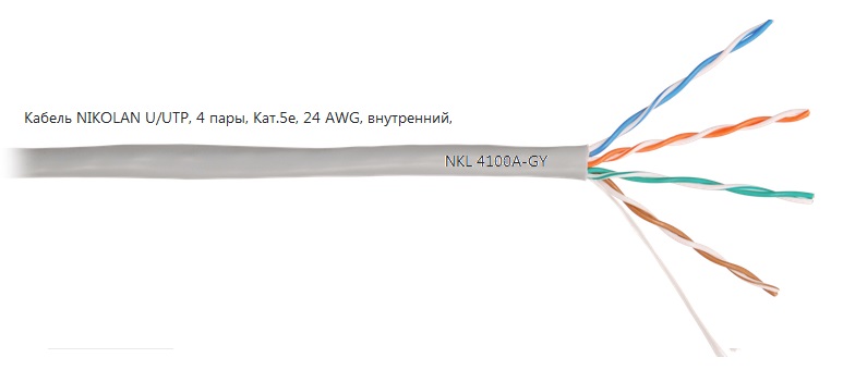 NKL 4100A-GY Кабель витая пара неэкранированный NIKOLAN U/UTP 4 пары, Кат.5e (Класс D), тест по ISO/IEC, 100МГц, одножильный, BC (чистая медь), 24AWG (0,50мм), внутренний, PVC нг(А), серый, 305м - гарантия: 5 лет / 15 лет системная