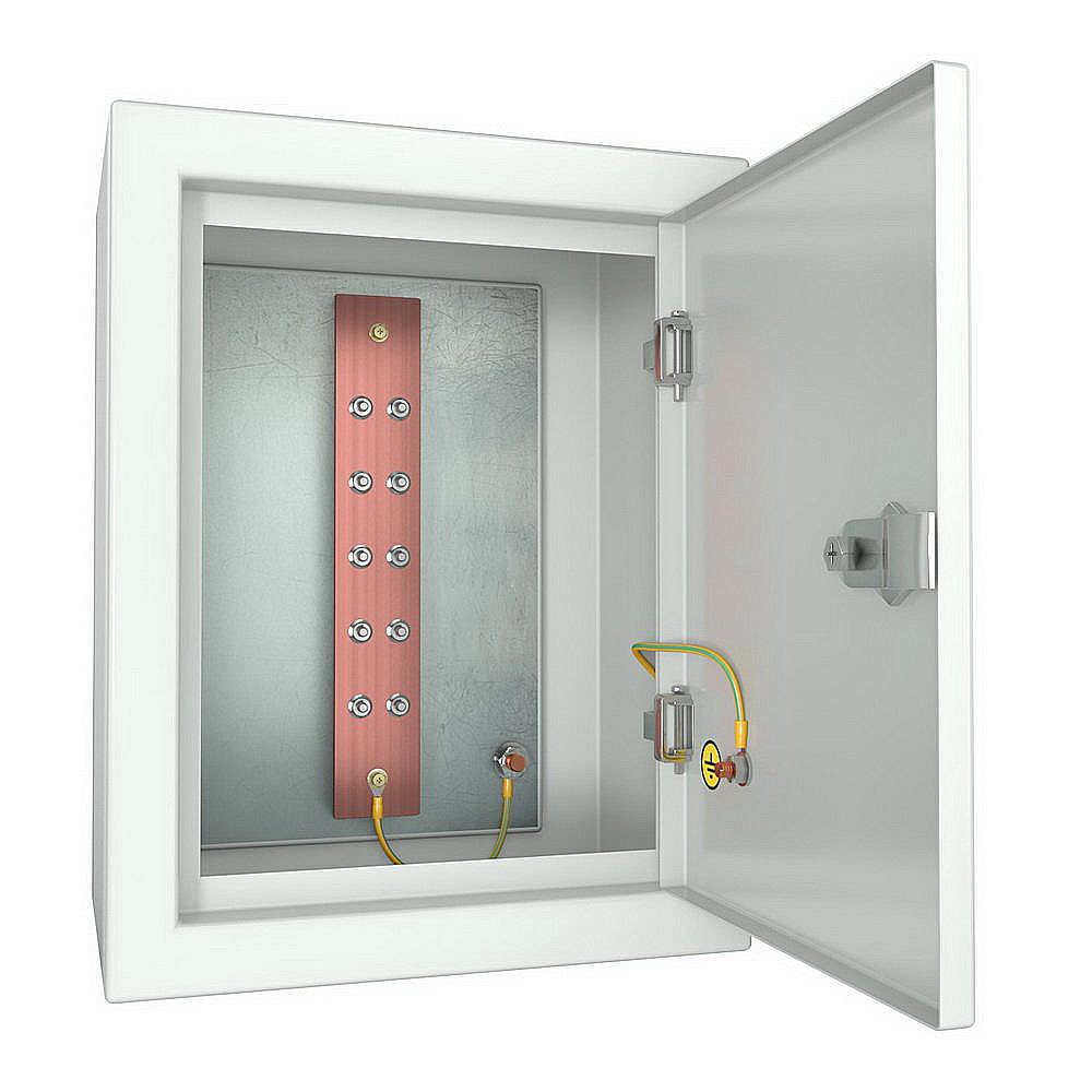 Стальной электрический щит IP31 с оцинкованной монтажной панелью, на которую установлена медная заземляющая полоса. Корпус стандартной комплектации: IP-31. Ящик выполнен из холодно-катанного тонколистового стального листа толщиной 1 мм. Конструкция ящика цельносварная, задняя стенка имеет четыре отверстия d=8 мм для крепления к стене, передняя дверь оснащена точечным замком. В нижней части шкафа имеются круглые отверстия d=32 мм для заведения кабеля заземления. Медная шина располагается горизонтально, крепиться через изоляторы SM-25 к оцинкованной монтажной панели, медная шина укомплектована винтами М6х12 и гайками с фланцем с насечкой М6.