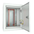 Стальной электрический щит IP31 с оцинкованной монтажной панелью, на которую установлена медная заземляющая полоса. Корпус стандартной комплектации: IP-31. Ящик выполнен из холодно-катанного тонколистового стального листа толщиной 1 мм. Конструкция ящика цельносварная, задняя стенка имеет четыре отверстия d=8 мм для крепления к стене, передняя дверь оснащена точечным замком. В нижней части шкафа имеются круглые отверстия d=32 мм для заведения кабеля заземления. Медные шины 2 шт располагаются вертикально, соединены медной перемычкой, на оцинкованную монтажную панель крепятся через изоляторы SM-25, медная шина укомплектована винтами М6х12 и гайками с фланцем с насечкой М6.