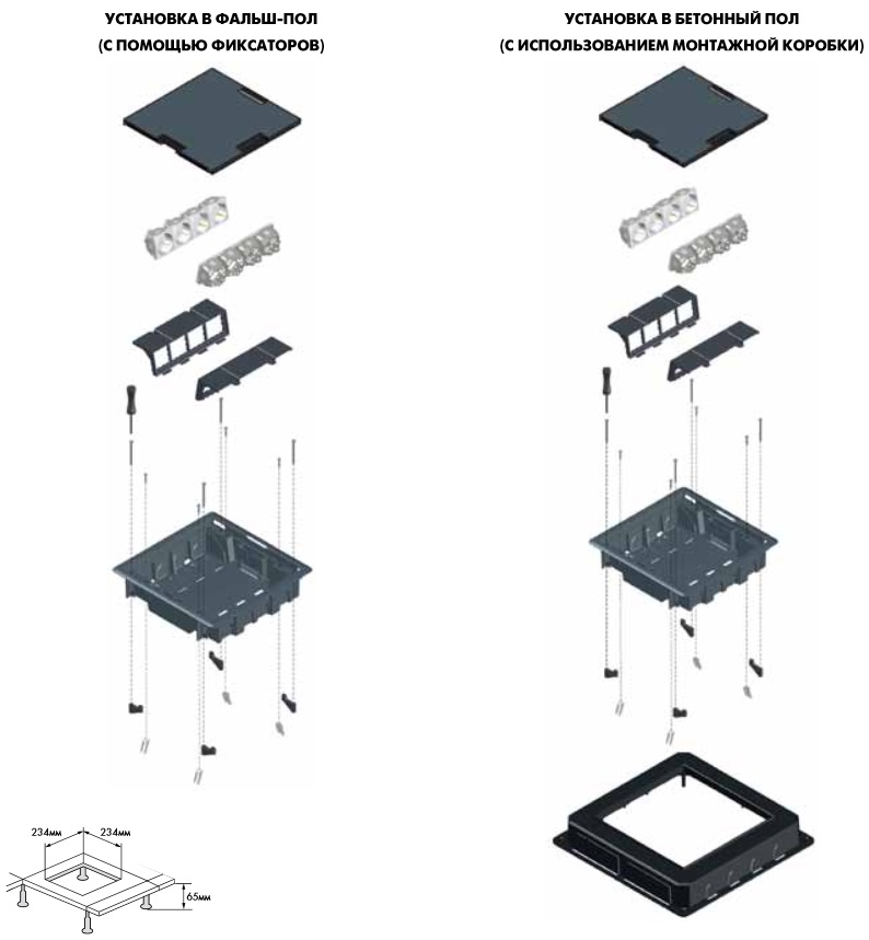Главная / Каталог / Люки напольные и Колонны / Люки для розеток в пол и в стол / Люк для розеток в полу под покрытие / Люк напольный Efapel / 83058 Коробка под заливку для люка на 16 модулей (