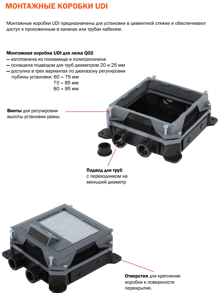 | Пластиковая коробка(Монтажная коробка) UDI Q02 15913.23 для заливки для люка Q02, высота 60-75 мм (15913.23) Electraplan Монтажная коробка UDI Q02 из полиамида и полипропилена имеет размеры отверстия 132х132. ![]() ![]() |