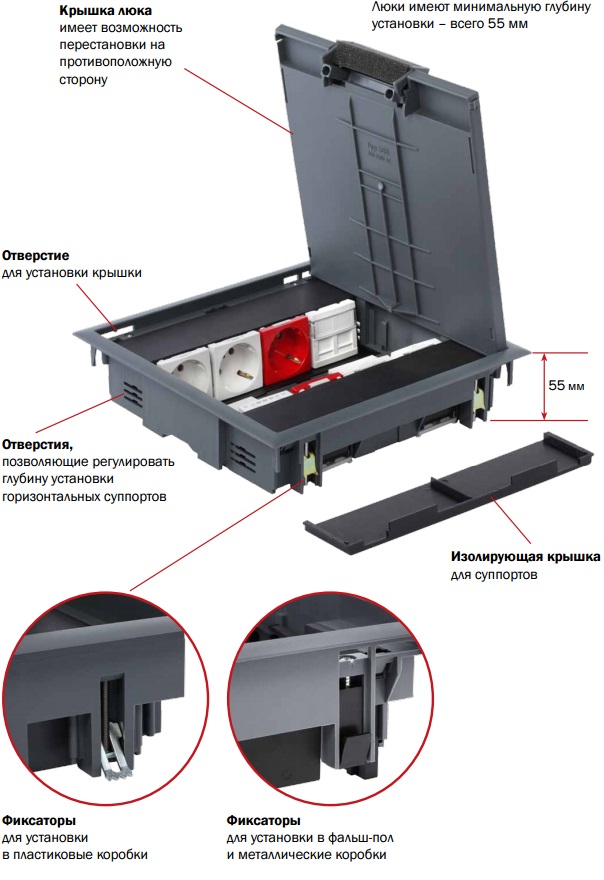 | Люк на 8-12 модулей 45х45 мм KDO Q2 SR5 7011, серый (внешние размеры 242х242 мм, размеры отверстия 228х228 мм) Electraplan Люк KDO Q2 SR5 7011(30316.41) Изготовлен из полиамида – Для установки 8 механизмов 45 x 45 мм в вертикальных суппортах Размеры: – с кромкой для мягких напольных покрытий – 242 х 242 мм – с кромкой для твердых напольных покрытий – 234 х 234 мм – установочное отверстие – 228 х 228 мм – минимальная установочная глубина – 55 мм + 2 модуля 22,5 x 45 мм на основании люка – Для установки 12 механизмов 45х45 мм в горизонтальных суппорта – Для мягких напольных покрытий толщиной 5, 8, 12 мм – Для твердых напольных покрытий толщиной 12 и 22 м – Цвет Серый RAL 7011 ![]() ![]() |