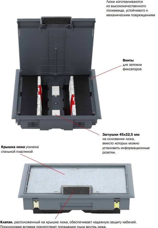 Главная / Каталог / Люки напольные и Колонны / Люки для розеток в пол и в стол / Люк для розеток в полу под покрытие / Люк напольный на 8 модулей Electraplan (Под санкциями - замена на Efapel или Экопласт) / 30316.41 Люк на 8-12 модулей 45х45 мм KDO Q2 SR5 7