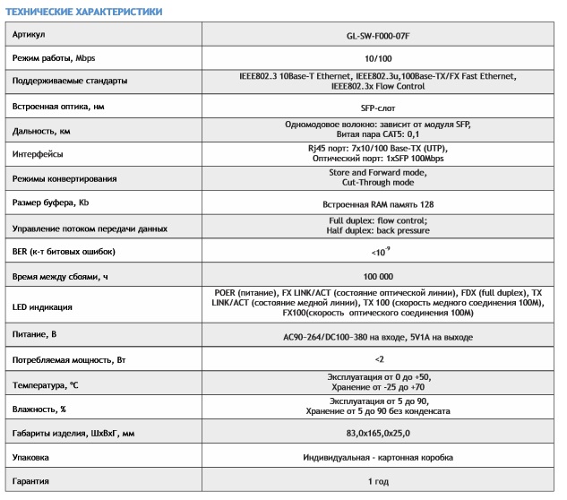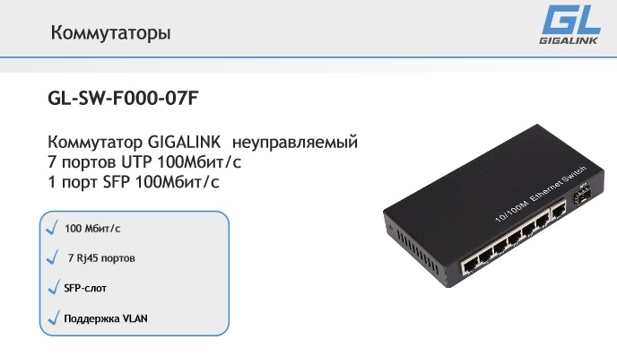 GL-SW-F000-07F Коммутатор неуправляемый 7 портов UTP 100Мбит/c 1 порт SFP 100Мбит/c (GL-F700) GIGALINK