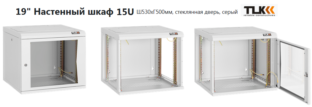 TWC-155350-G-W-GY шкаф 19" 15U TLK Настенный двухсекционный телекоммуникационный стеклянная дверь Ш530хВ732хГ500мм серый
