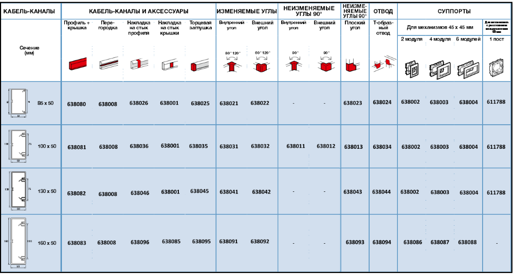 Общие характеристики кабель каналов METRA установочный (для серии Mosaic) Габариты кабель канала серии METRA (артикул и типоразмер) : L638080 (85х50 мм), L638081 (100х50 мм), L638082 (130х50 мм), L638083 (160х50 мм). Один каталожный номер для кабель-канала в сборе с крышкой. Используются для прокладки слаботочных и силовых кабелей. Монтаж в вертикальном и горизонтальном положениях.